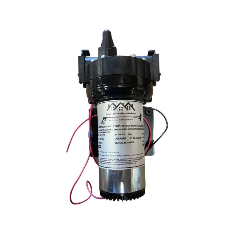 Kroon Softwash pomp 8 liter per minuut. Speciale Softwash pomp voor Natrium Hypochloriet. De Kroon Softwash diafragma pomp 8 Lpm levert krachtige stroomsnelheden bij drukken tot 80 PSI/5,5 Bar. Ons gepatenteerde 5-kamermembraan en zuigerontwerp laat deze pompen uitzonderlijk stil werken, met minimale pulsaties. De pompen kunnen urenlang onafgebroken worden gebruikt. De Softwash pompen kunnen worden aangestuurd door een drukschakelaar/varistreamer en werken op 12 volt.