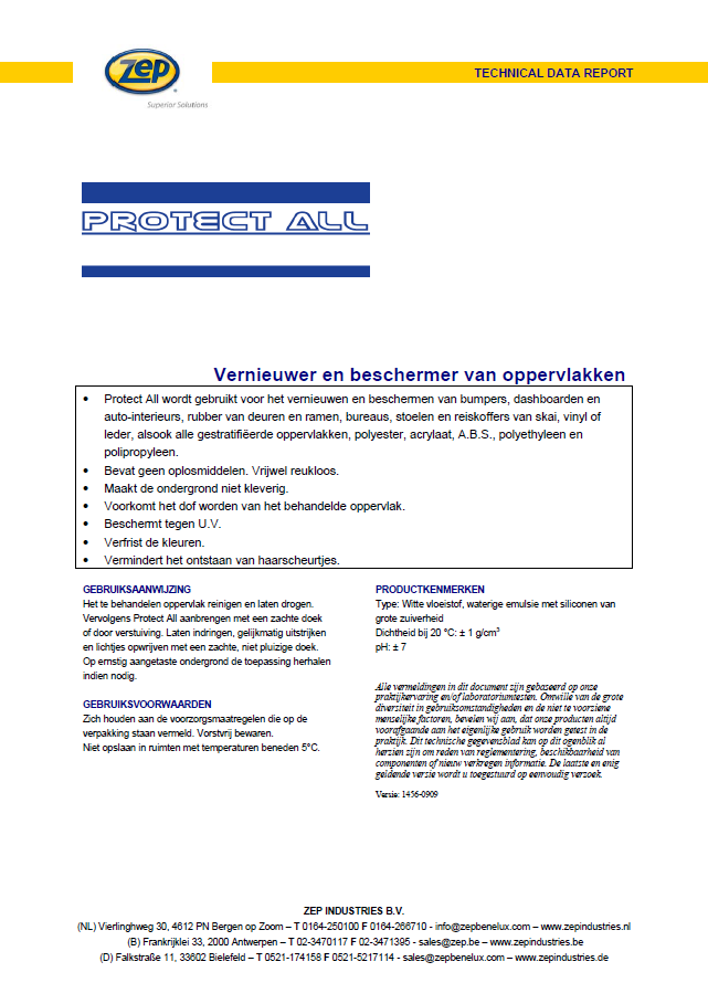 Voor het vernieuwen en beschermen van bumpers, dashboarden en auto-interieurs, rubber van deuren en ramen, bureaus, stoelen en reiskoffers van skai, vinyl of leder, alsook alle gestratifiëerde oppervlakken, polyester, acrylaat, A.B.S., polyethyleen en polipropyleen. Maakt de ondergrond niet kleverig. Beschermt tegen U.V. Verfrist de kleuren. Veiligheidsinformatie Technische informatie